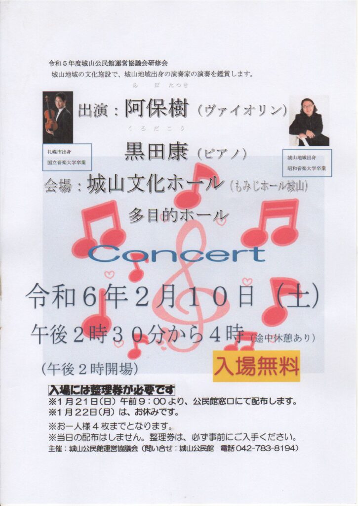 相模原市城山文化ホールにて地域交流のコンサートに講師の阿保が出演致します!