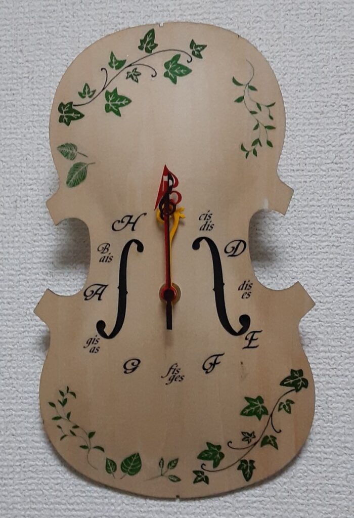 針にト音記号、ヘ音記号、ハ音記号のデザインをあしらって、数字のところはドイツ音名になっています。